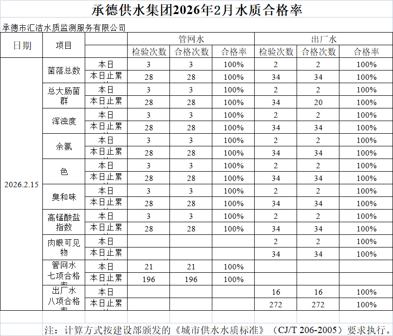 承德供水集團2026年2月15日水質(zhì)合格率