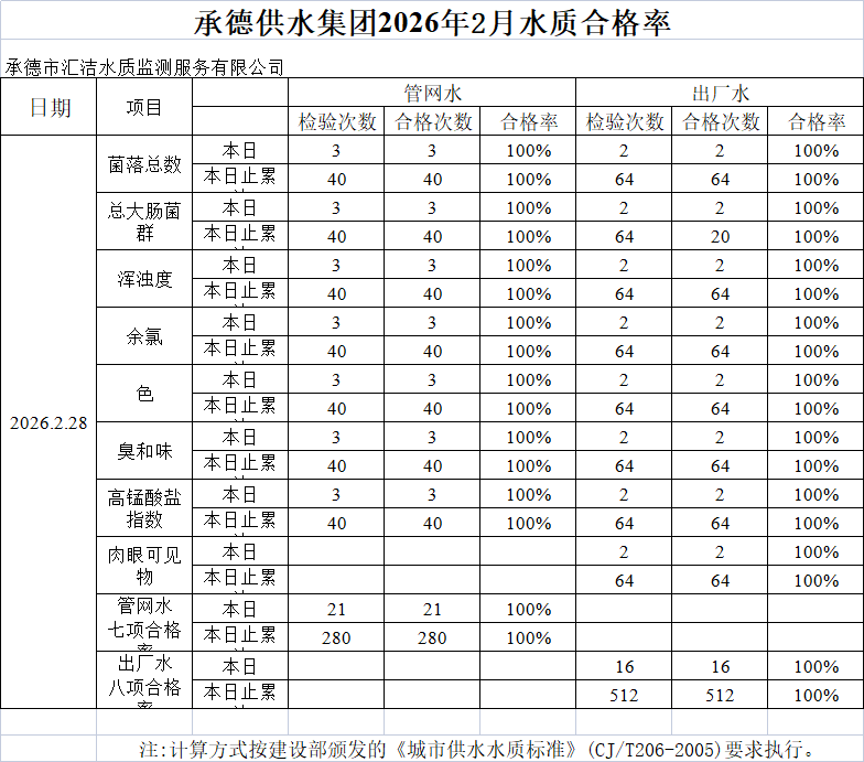 承德供水集團(tuán)2026年2月28日水質(zhì)合格率